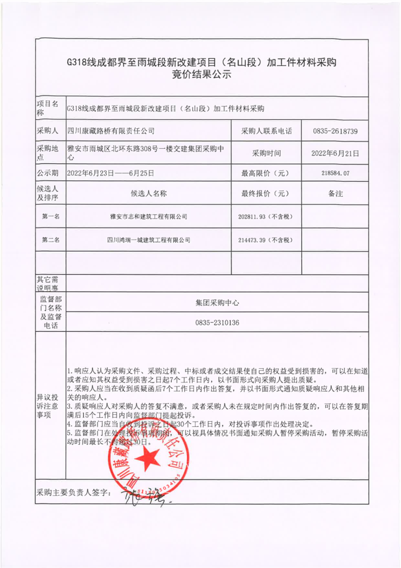 四川康藏路橋有限責(zé)任公司G318線成都界至雨城段新改建項目(名山段)加工件材料采購競價結(jié)果公示