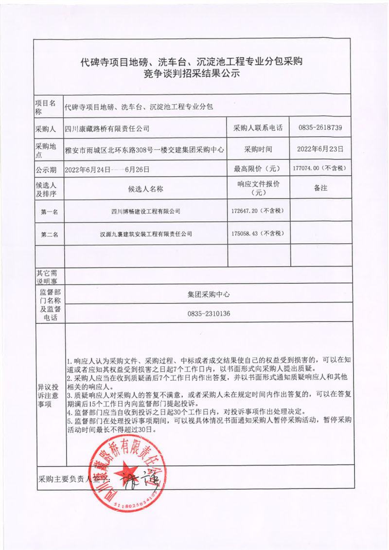 四川康藏路橋有限責(zé)任公司代碑寺項(xiàng)目地磅、洗車(chē)臺(tái)、沉淀池工程專(zhuān)業(yè)分包采購(gòu)競(jìng)爭(zhēng)談判招采結(jié)果公示