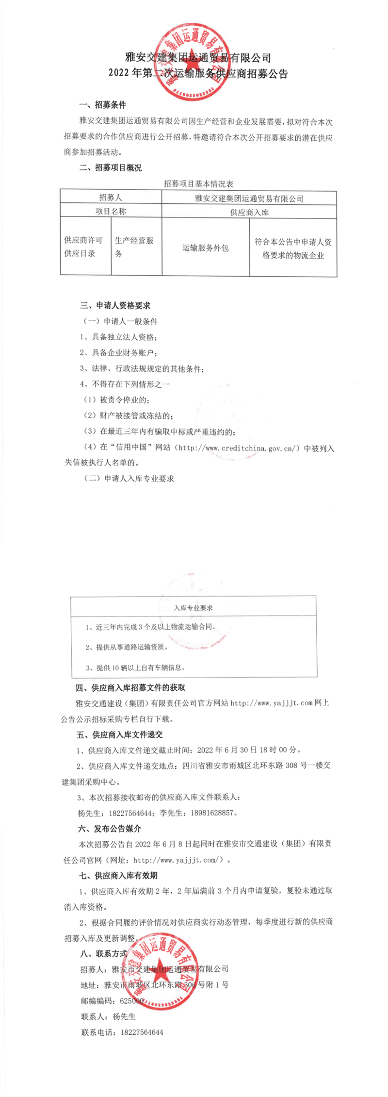 雅安交建集團運通貿(mào)易有限公司2022年第二次運輸服務(wù)供應(yīng)商招募公告