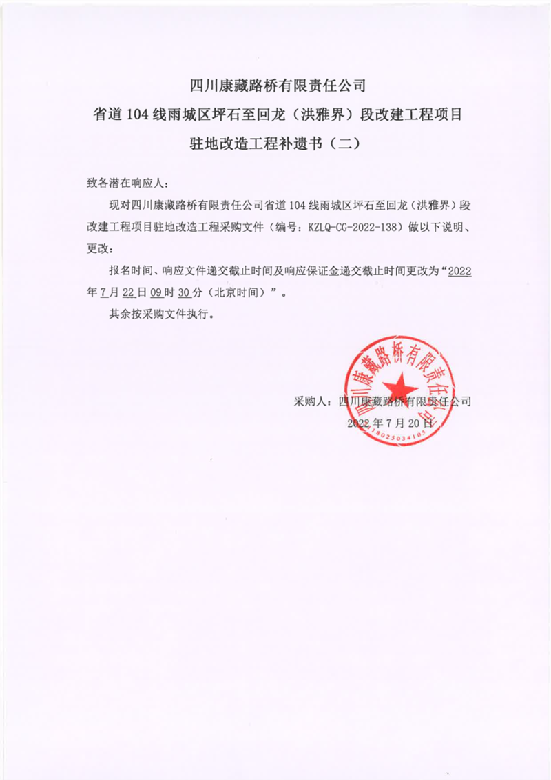 四川康藏路橋有限責(zé)任公司省道104線雨城區(qū)坪石至回龍(洪雅界)段改建工程項目駐地改造工程補遺書(二)