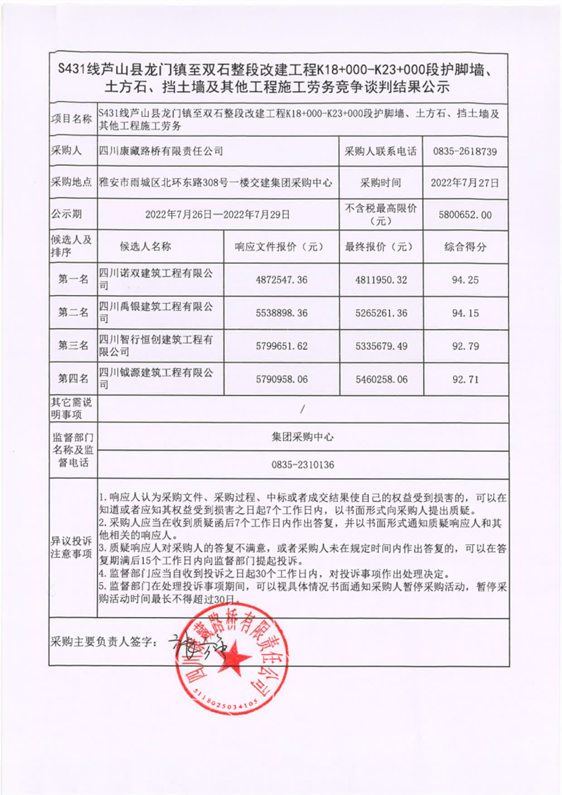 四川康藏路橋有限責任公司S431線蘆山縣龍門鎮(zhèn)至雙石整段改建工程K18+000-K23+000段護腳墻、土方石、擋土墻及其他工程施工勞務競爭談判結果公示