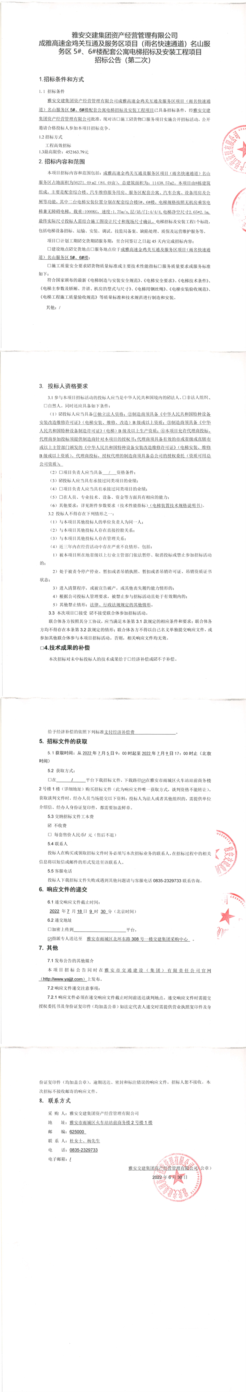 雅安交建集團資產經營管理有限公司成雅高速金雞關互通及服務區(qū)項目(雨名快速通道)名山服務區(qū)5#、6#樓配套公寓電梯招標及安裝工程項目招標公告(第二次)