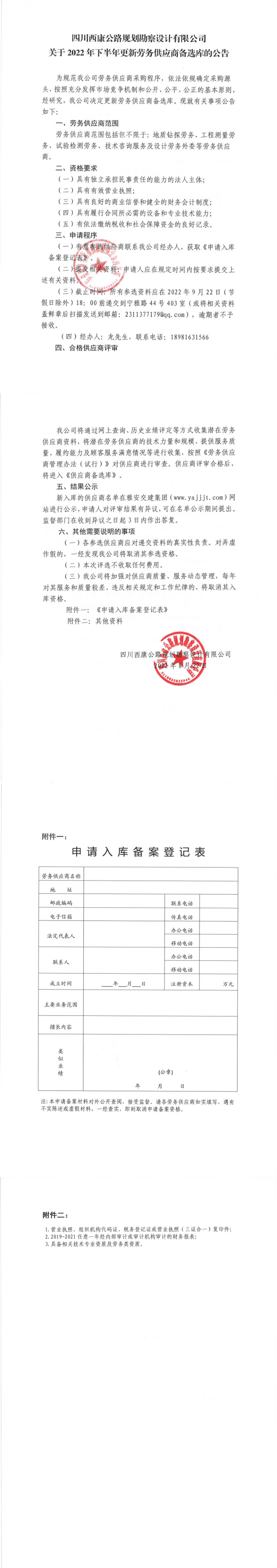 四川西康公路規(guī)劃勘察設(shè)計(jì)有限公司關(guān)于2022年下半年更新勞務(wù)供應(yīng)商備選庫(kù)的公告