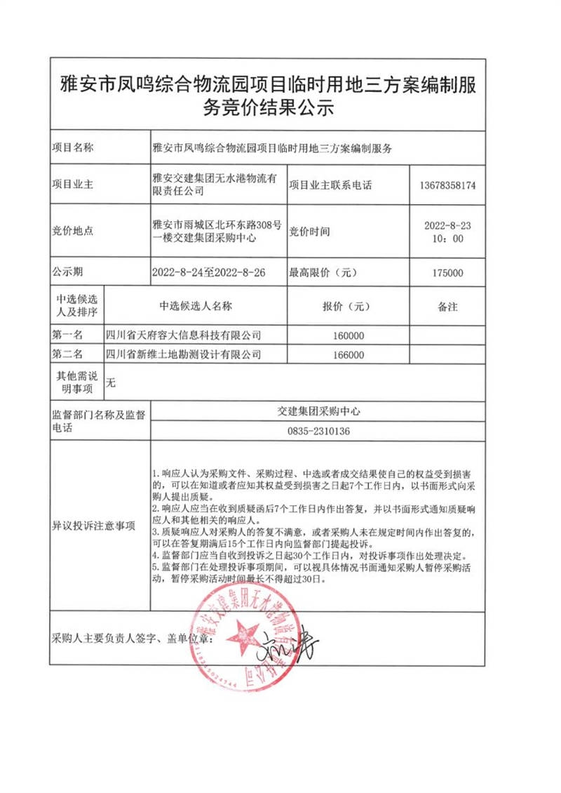 雅安交建集團(tuán)無水港物流有限責(zé)任公司雅安市鳳鳴綜合物流園項(xiàng)目臨時(shí)用地三方案編制服務(wù)競(jìng)價(jià)結(jié)果公示