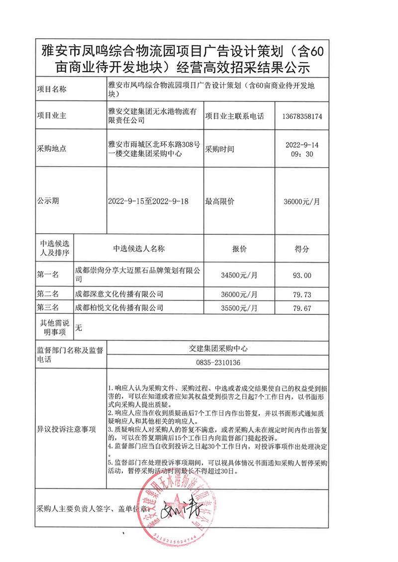雅安交建集團(tuán)無水港物流有限責(zé)任公司雅安市鳳鳴綜合物流園項(xiàng)目廣告設(shè)計(jì)策劃(含60畝商業(yè)待開發(fā)地塊)經(jīng)營高效招采結(jié)果公示