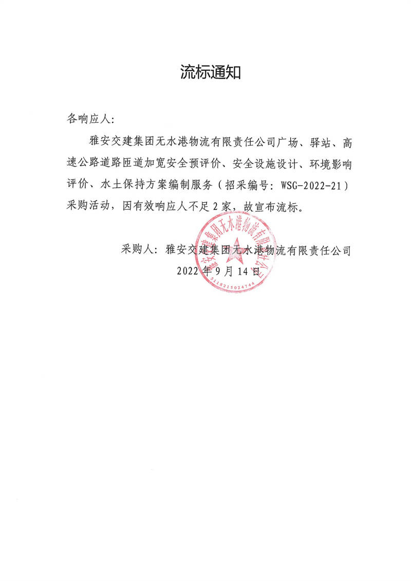 雅安交建集團(tuán)無水港物流有限責(zé)任公司廣場、驛站、高速公路道路匝道加寬安全預(yù)評(píng)價(jià)、安全設(shè)施設(shè)計(jì)、環(huán)境影響評(píng)價(jià)、水土保持方案編制服務(wù)采購流標(biāo)通知