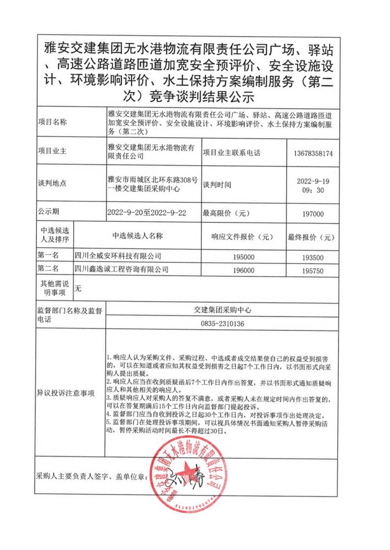雅安交建集團無水港物流有限責(zé)任公司廣場、驛站、高速公路道路匝道加寬安全預(yù)評價、安全設(shè)施設(shè)計、環(huán)境影響評價、水土保持方案編制服務(wù)(第二次)競爭談判結(jié)果公示