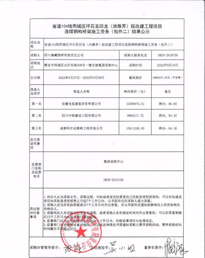 四川康藏路橋有限責任公司省道104線雨城區(qū)坪石至回龍(洪雅界)段改建工程項目連續(xù)鋼構橋梁施工勞務(包件二)結果公示