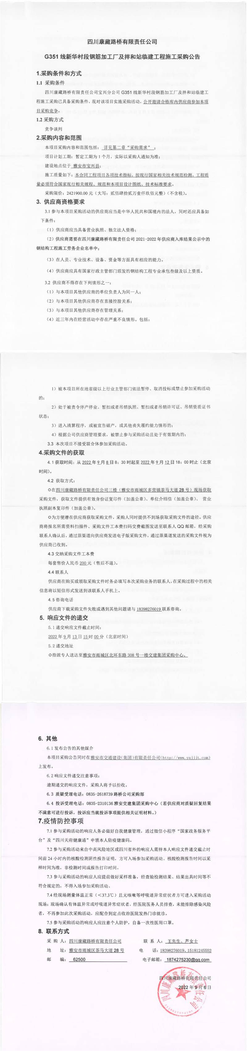 四川康藏路橋有限責(zé)任公司G351線新華村段鋼筋加工廠及拌和站臨建工程施工采購公告