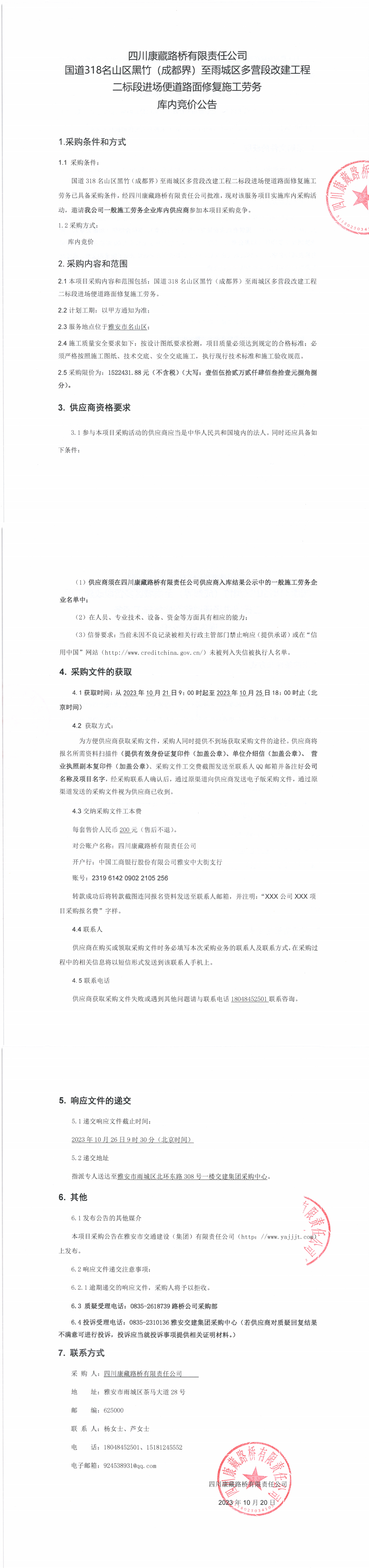 四川康藏路橋有限責(zé)任公司國道318名山區(qū)黑竹(成都界)至雨城區(qū)多營段改建工程二標(biāo)段進場便道路面修復(fù)施工勞務(wù)庫內(nèi)競價公告
