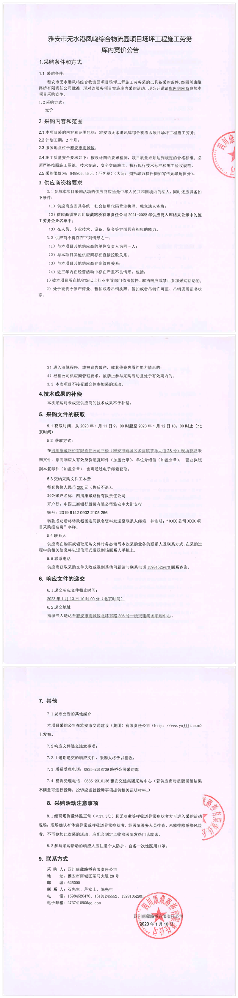 四川康藏路橋有限責(zé)任公司雅安市無水港鳳鳴綜合物流園項(xiàng)目場坪工程施工勞務(wù)庫內(nèi)競價(jià)公告