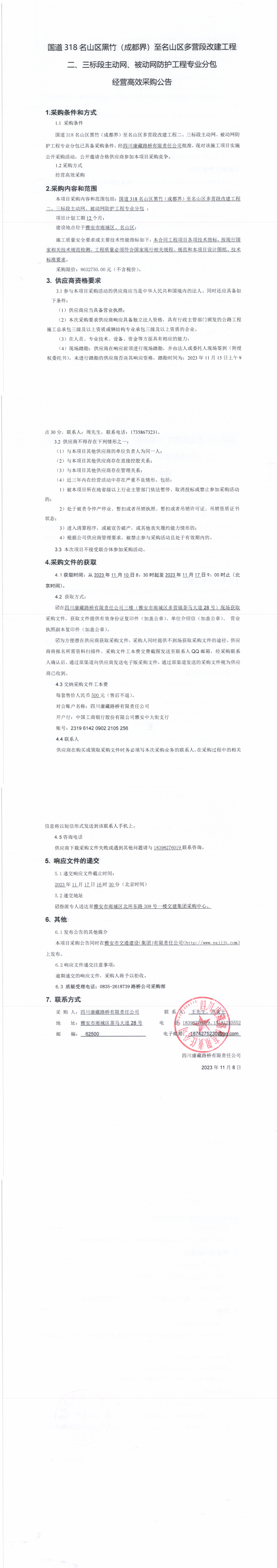 四川康藏路橋有限責任公司國道318名山區(qū)黑竹(成都界)至名山區(qū)多營段改建工程二、三標段主動網(wǎng)、被動網(wǎng)防護工程專業(yè)分包經(jīng)營高效采購公告