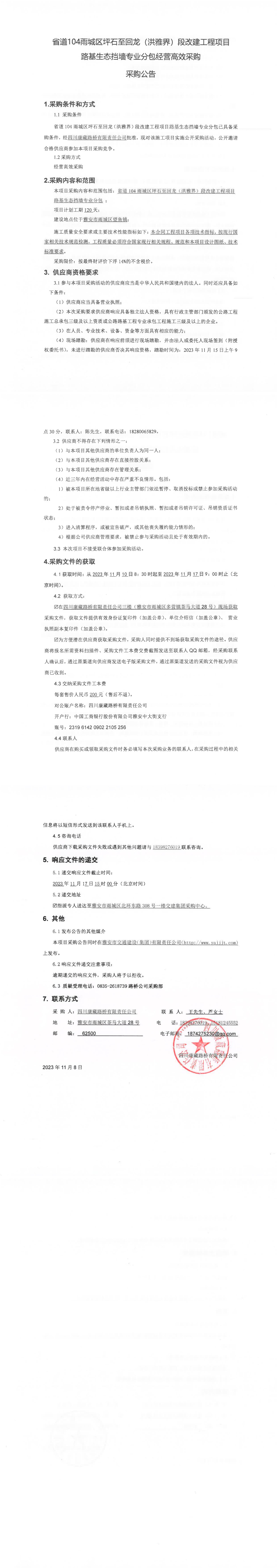 四川康藏路橋有限責(zé)任公司省道104雨城區(qū)坪石至回龍(洪雅界)段改建工程項(xiàng)目路基生態(tài)擋墻專(zhuān)業(yè)分包經(jīng)營(yíng)高效采購(gòu)公告