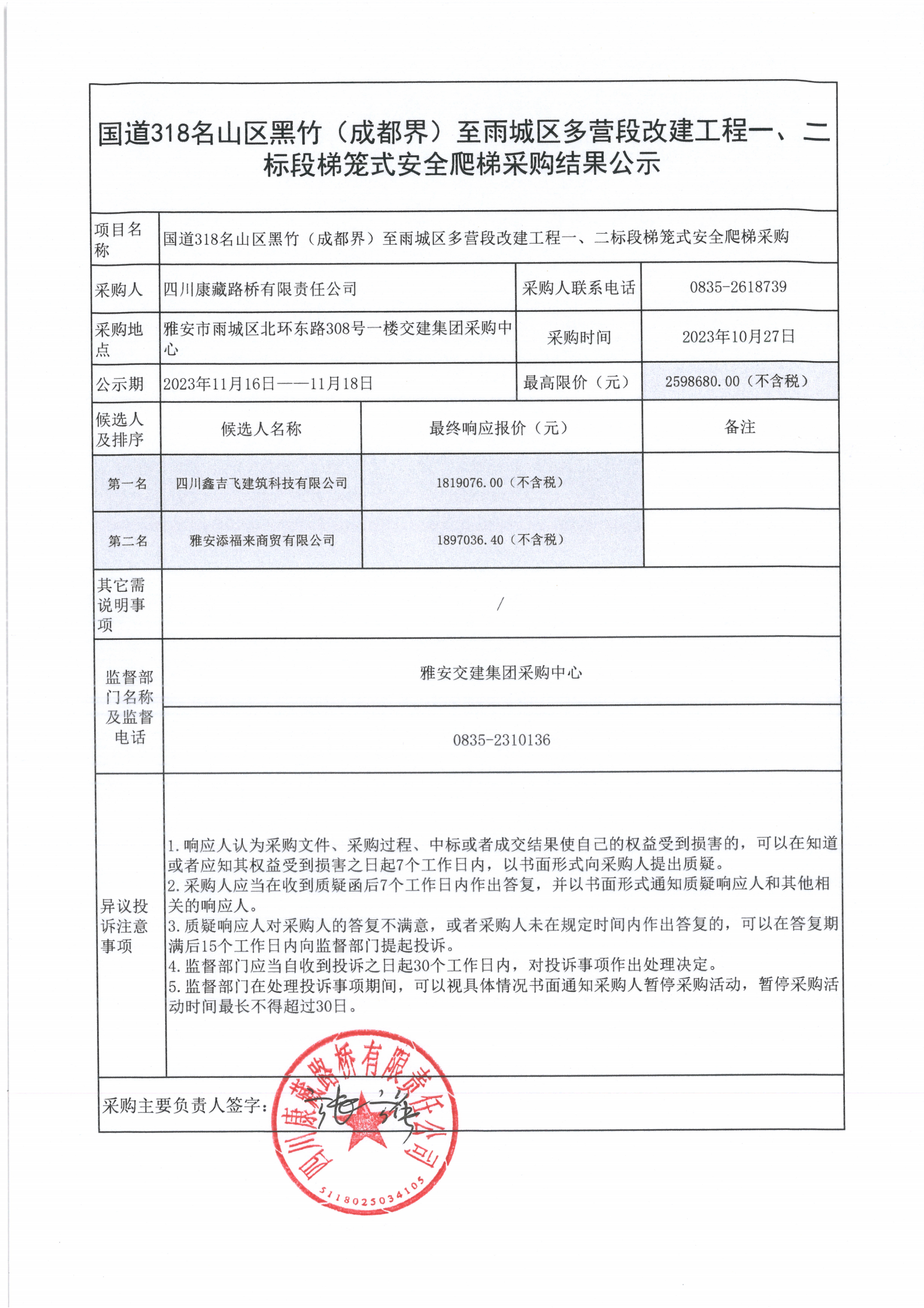 四川康藏路橋有限責(zé)任公司國道318名山區(qū)黑竹(成都界)至雨城區(qū)多營段改建工程一、二標段梯籠式安全爬梯采購結(jié)果公示