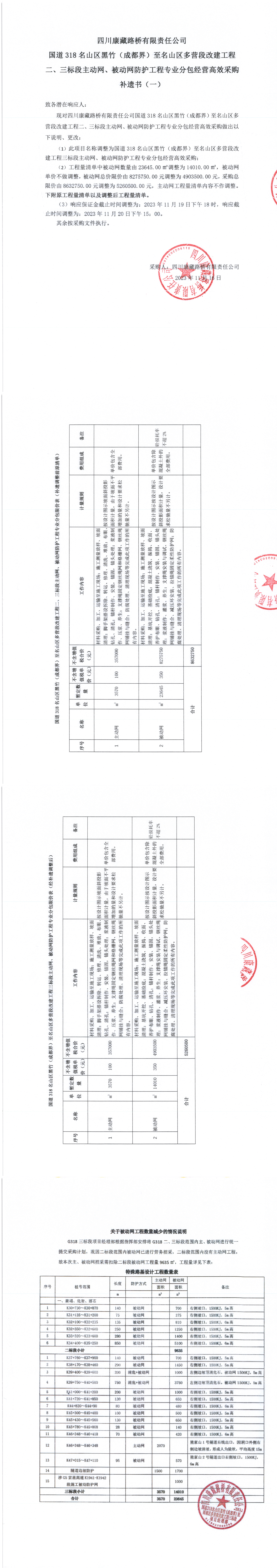 四川康藏路橋有限責(zé)任公司國(guó)道318名山區(qū)黑竹(成都界)至名山區(qū)多營(yíng)段改建工程二、三標(biāo)段主動(dòng)網(wǎng)、被動(dòng)網(wǎng)防護(hù)工程專業(yè)分包經(jīng)營(yíng)高效采購(gòu)補(bǔ)遺書(一)