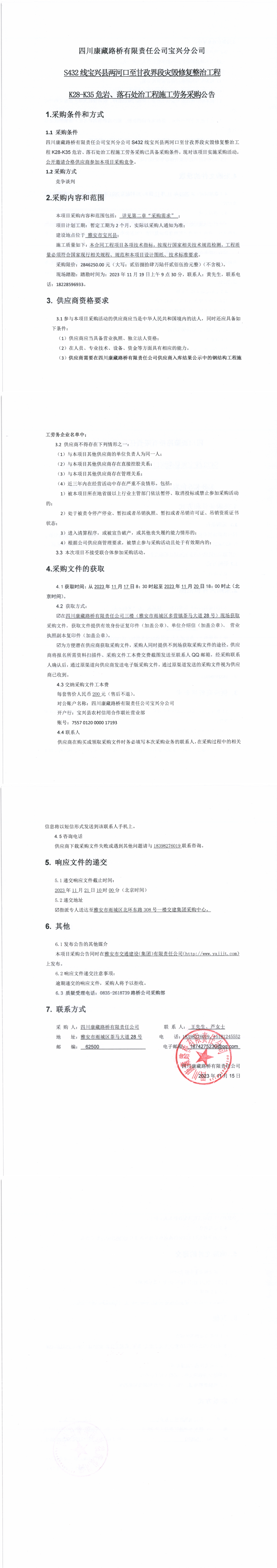 四川康藏路橋有限責(zé)任公司寶興分公司S432線(xiàn)寶興縣兩河口至甘孜界段災(zāi)毀修復(fù)整治工程K28-K35危巖、落石處治工程施工勞務(wù)采購(gòu)公告