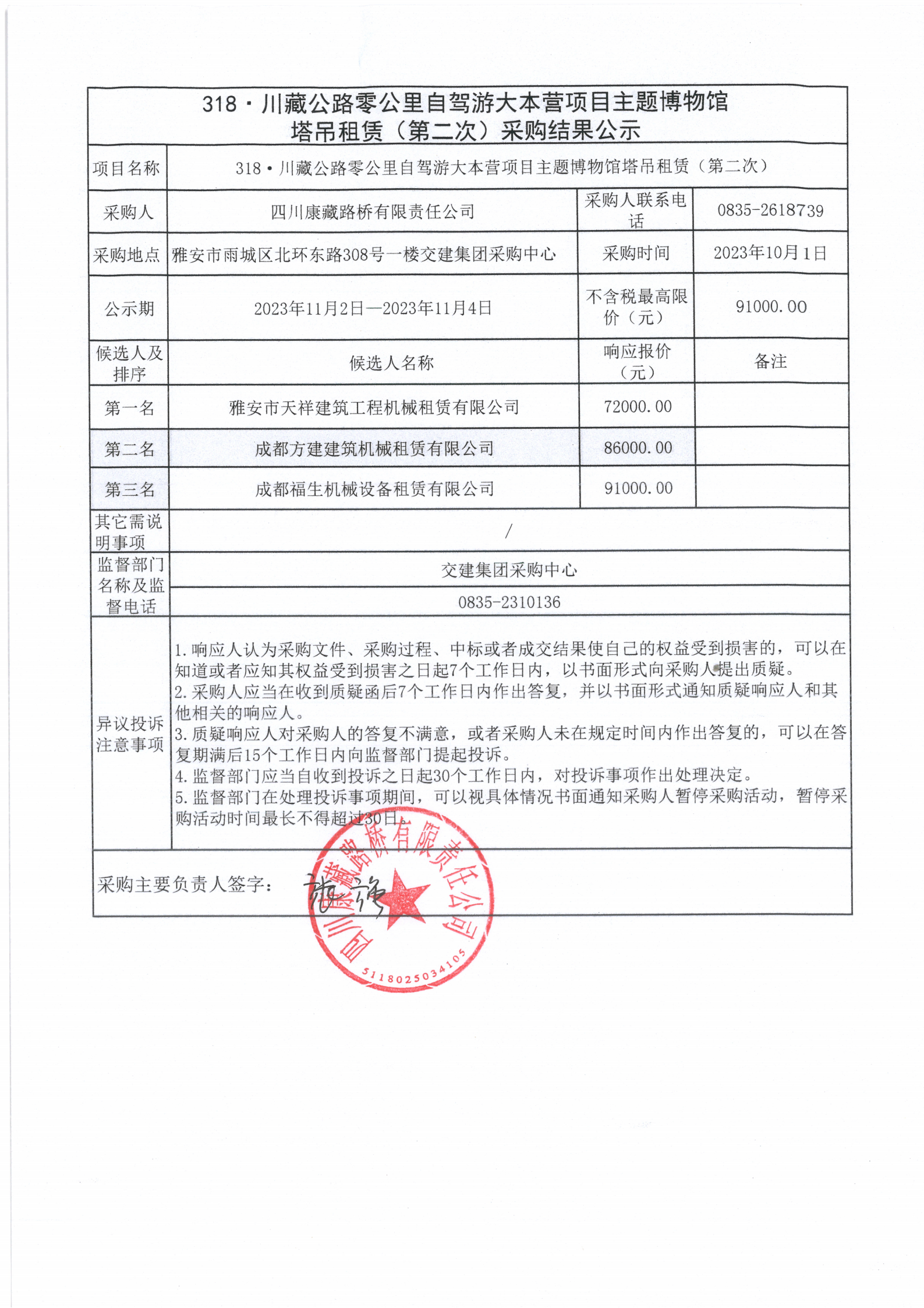 四川康藏路橋有限責(zé)任公司318·川藏公路零公里自駕游大本營(yíng)項(xiàng)目主題博物館塔吊租賃(第二次)采購(gòu)結(jié)果公示