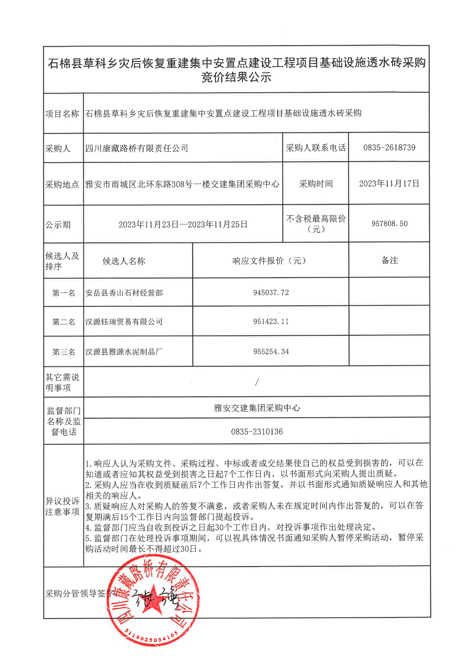 四川康藏路橋有限責(zé)任公司石棉縣草科鄉(xiāng)集中安置點重建工程項目透水磚采購結(jié)果公示
