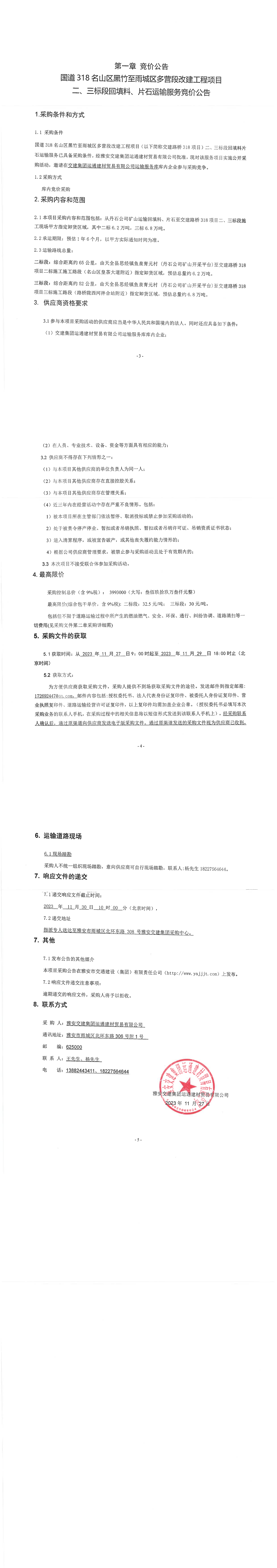 交建集團運通建材貿易有限公司國道318名山區(qū)黑竹至雨城區(qū)多營段改建工程項目二、三標段回填料、片石運輸服務競價公告