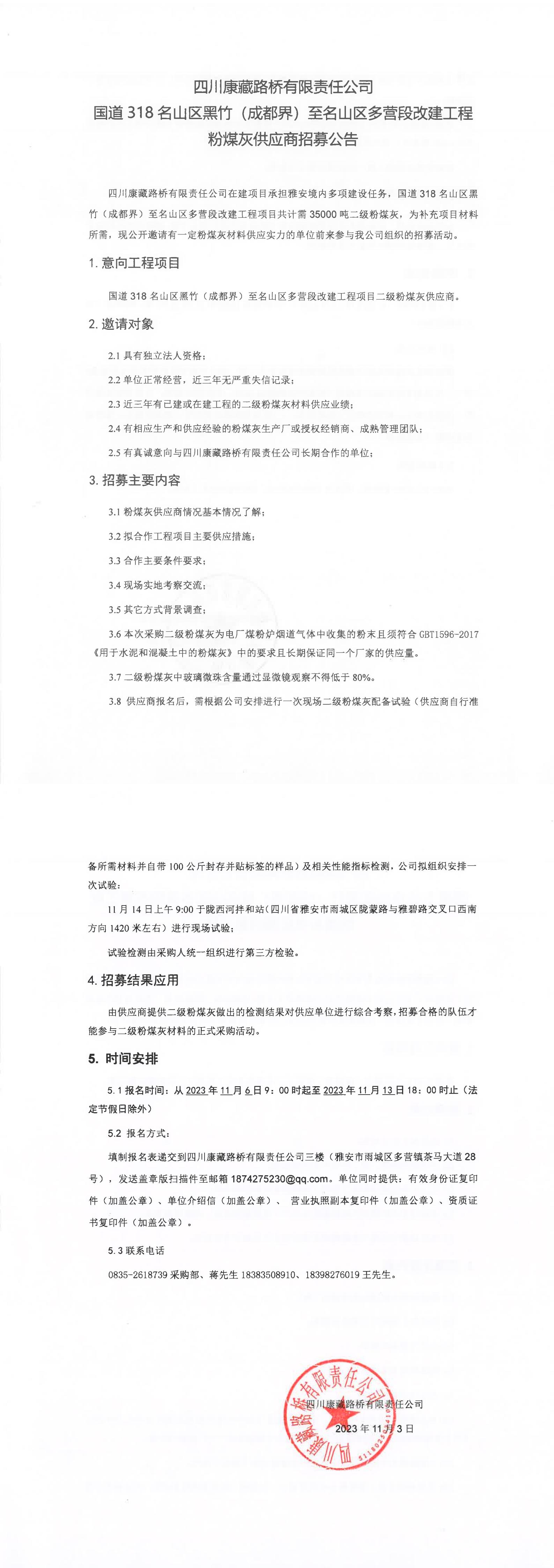 四川康藏路橋有限責任公司國道318名山區(qū)黑竹(成都界)至名山區(qū)多營段改建工程粉煤灰供應(yīng)商招募公告