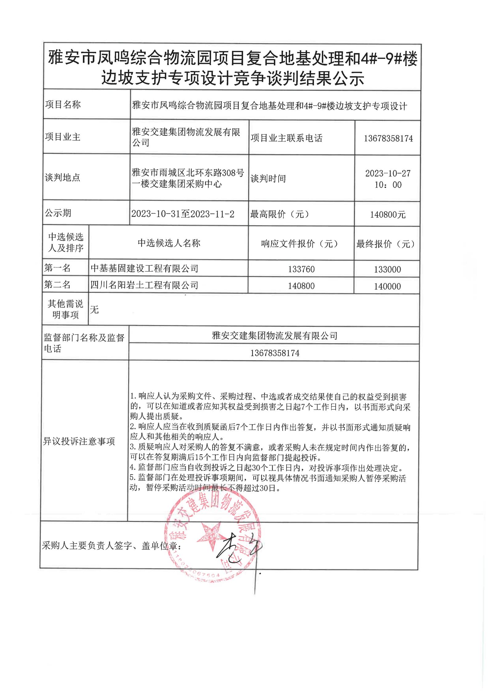 雅安交建集團物流發(fā)展有限公司雅安市鳳鳴綜合物流園項目復合地基處理和4#-9#樓邊坡支護專項設計競爭談判結果公示