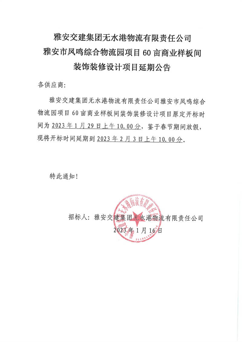 雅安交建集團無水港物流有限責(zé)任公司雅安市鳳鳴綜合物流園項目60畝商業(yè)樣板間裝飾裝修設(shè)計項目延期公告