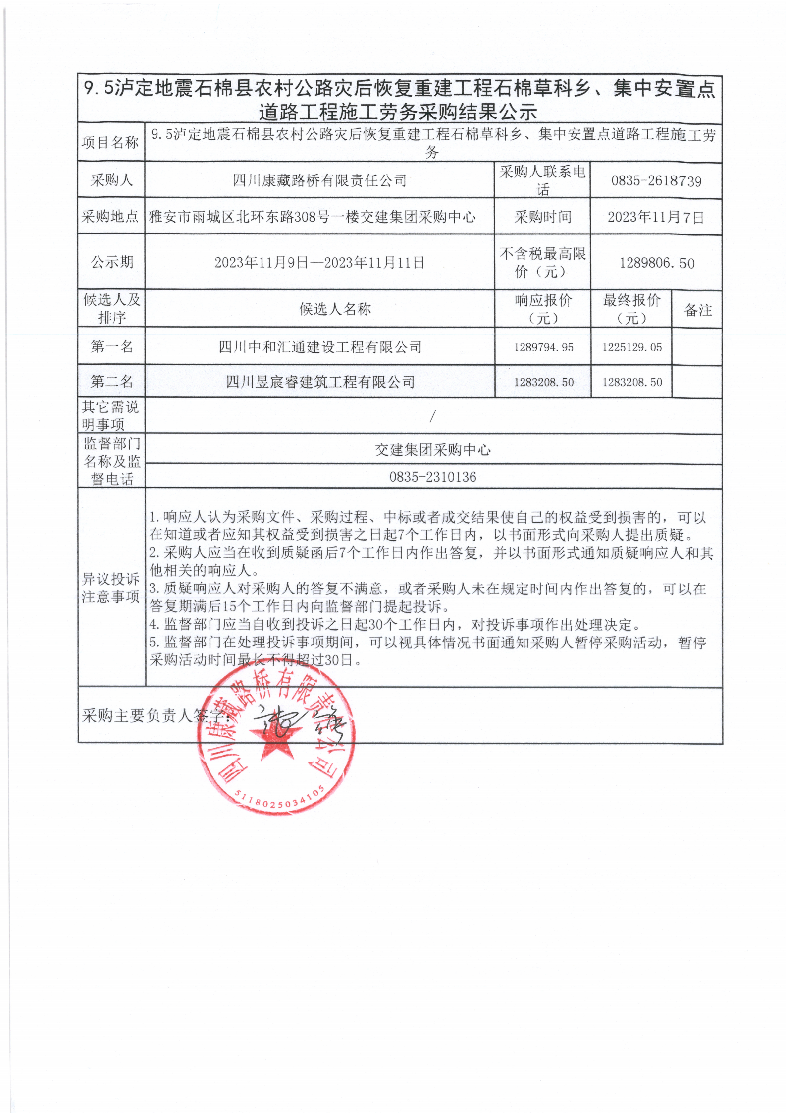 四川康藏路橋有限責任公司9.5瀘定地震石棉縣農村公路災后恢復重建工程石棉草科鄉(xiāng)、集中安置點道路工程施工勞務采購結果公示