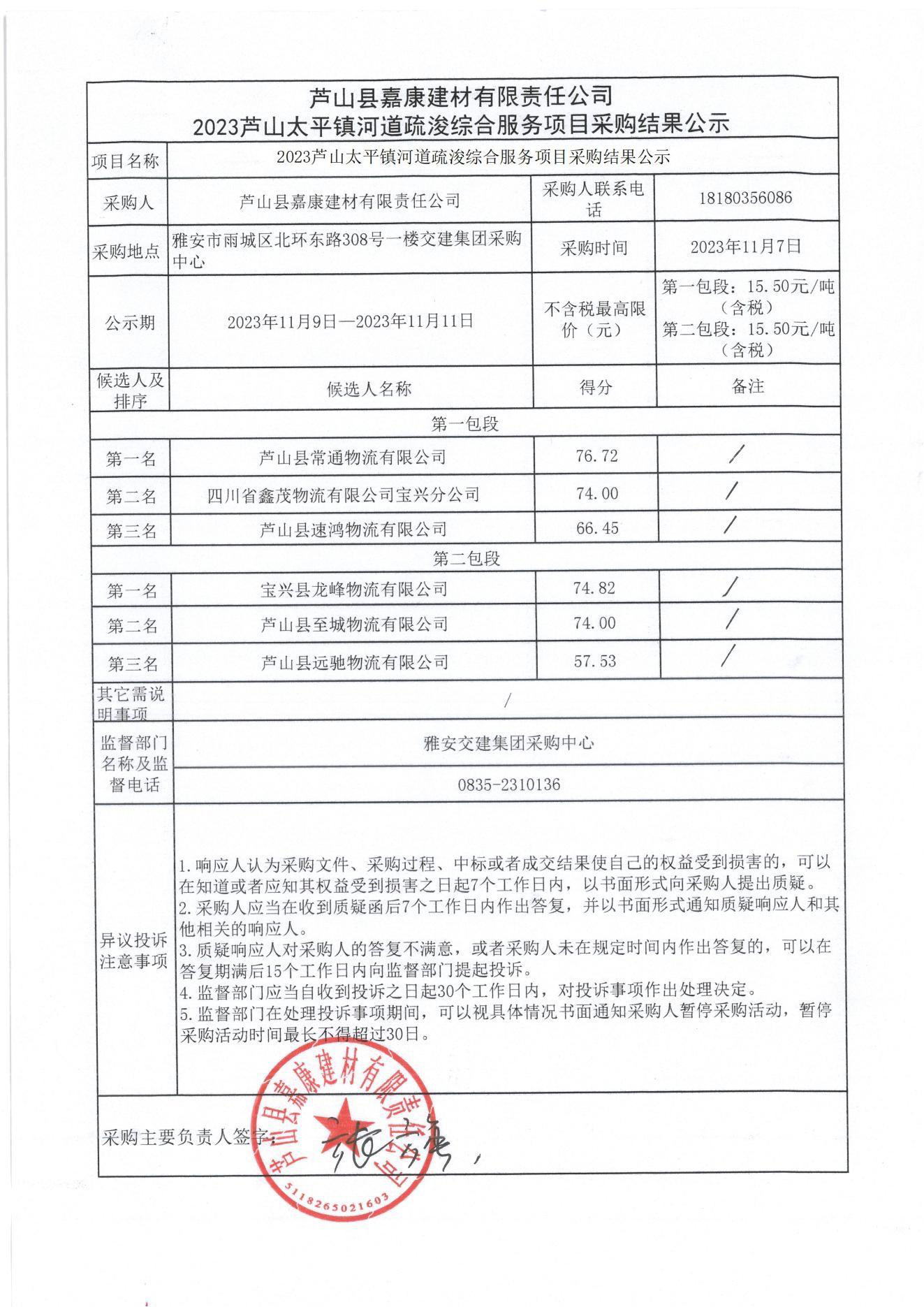 蘆山縣嘉康建材有限責任公司2023蘆山太平鎮(zhèn)河道疏浚綜合項目采購結果公示