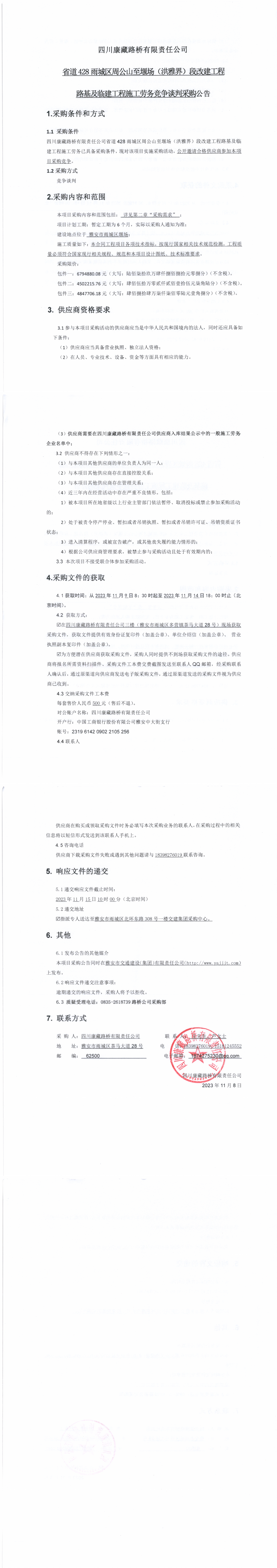 四川康藏路橋有限責(zé)任公司省道428雨城區(qū)周公山至堰場(洪雅界)段改建工程路基及臨建工程施工勞務(wù)競爭談判采購公告
