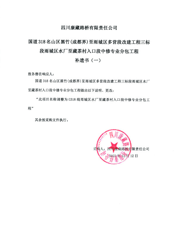 四川康藏路橋有限責(zé)任公司國(guó)道318名山區(qū)黑竹(成都界)至雨城區(qū)多營(yíng)段改建工程三標(biāo)段雨城區(qū)水廠至藏茶村入口段中修專業(yè)分包工程(補(bǔ)遺書一)