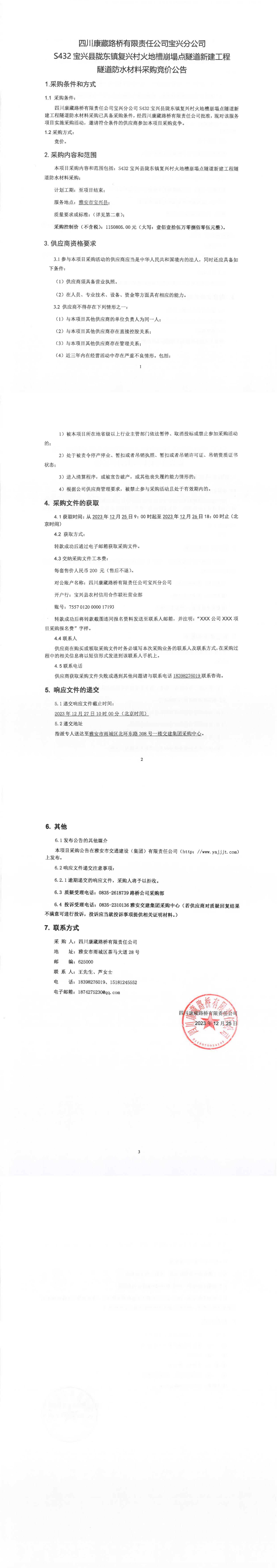 四川康藏路橋有限責(zé)任公司寶興分公司S432寶興縣隴東鎮(zhèn)復(fù)興村火地槽崩塌點隧道新建工程隧道防水材料采購競價公告