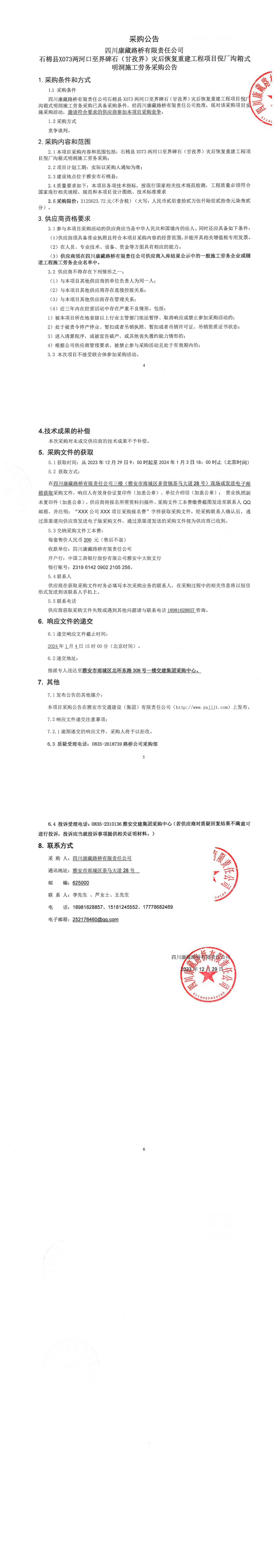 四川康藏路橋有限責(zé)任公司石棉縣X073兩河口至界碑石(甘孜界)災(zāi)后恢復(fù)重建工程項(xiàng)目倪廠溝箱式明洞施工勞務(wù)采購(gòu)公告