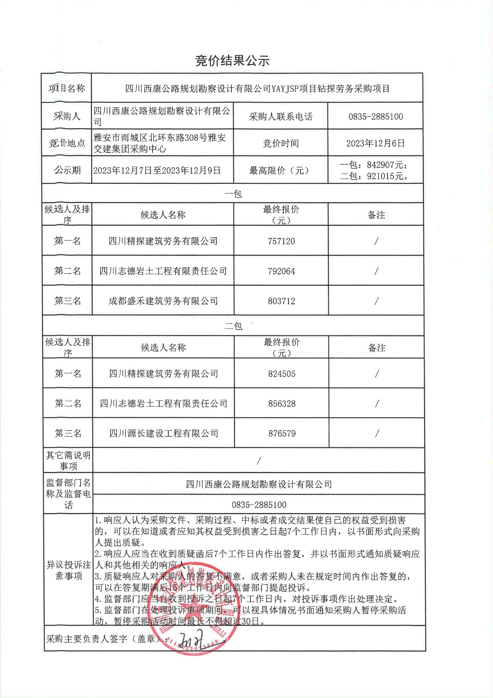 四川西康公路規(guī)劃勘察設(shè)計(jì)公司YAYJSP項(xiàng)目鉆探勞務(wù)采購(gòu)項(xiàng)目競(jìng)價(jià)結(jié)果公示