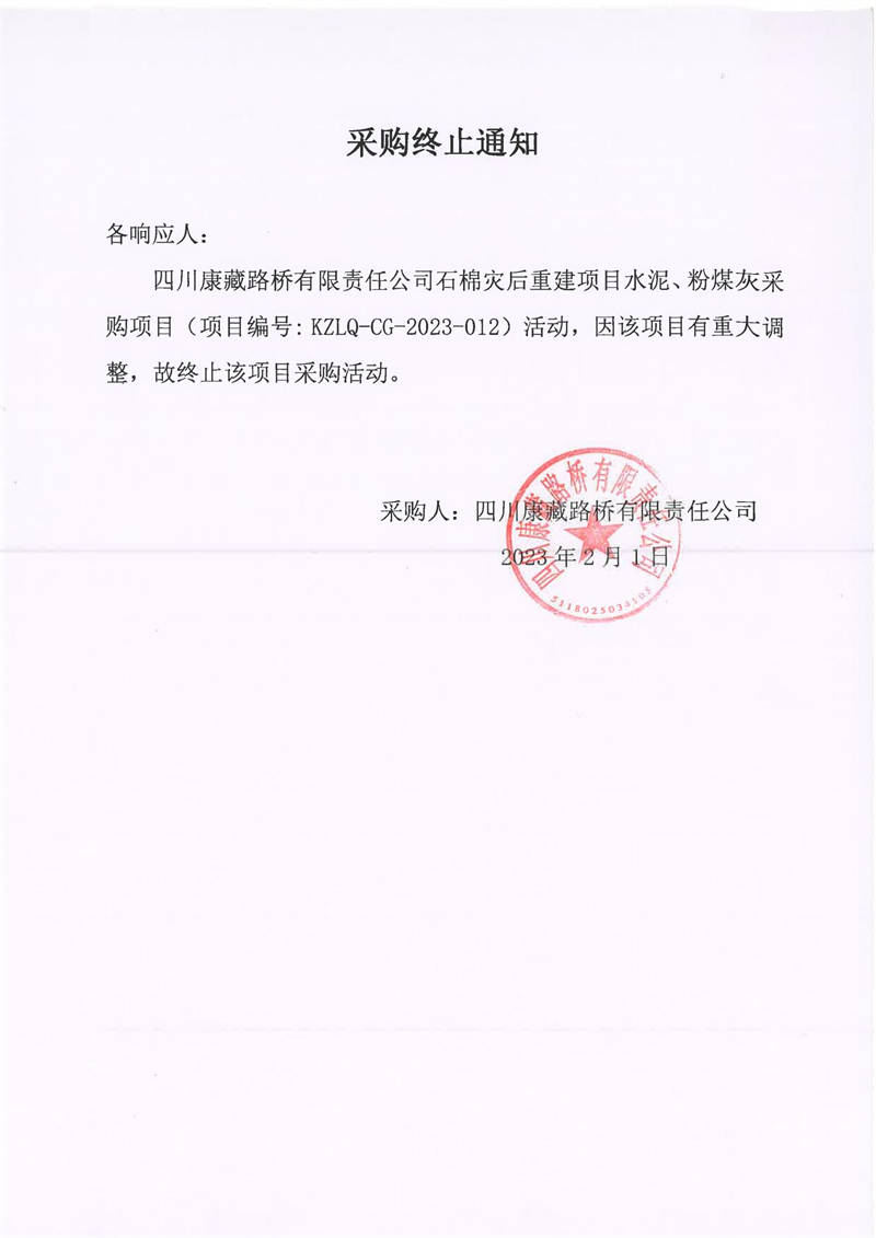 四川康藏路橋有限責任公司石棉災后重建項目水泥、粉煤灰采購項目采購終止通知