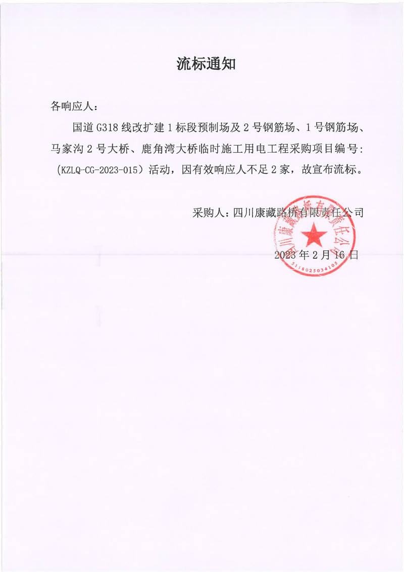 四川康藏路橋有限責(zé)任公司國道G318線改擴(kuò)建1標(biāo)段預(yù)制場及2號鋼筋場、1號鋼筋場、馬家溝2號大橋、鹿角灣大橋臨時施工用電工程采購項(xiàng)目流標(biāo)通知