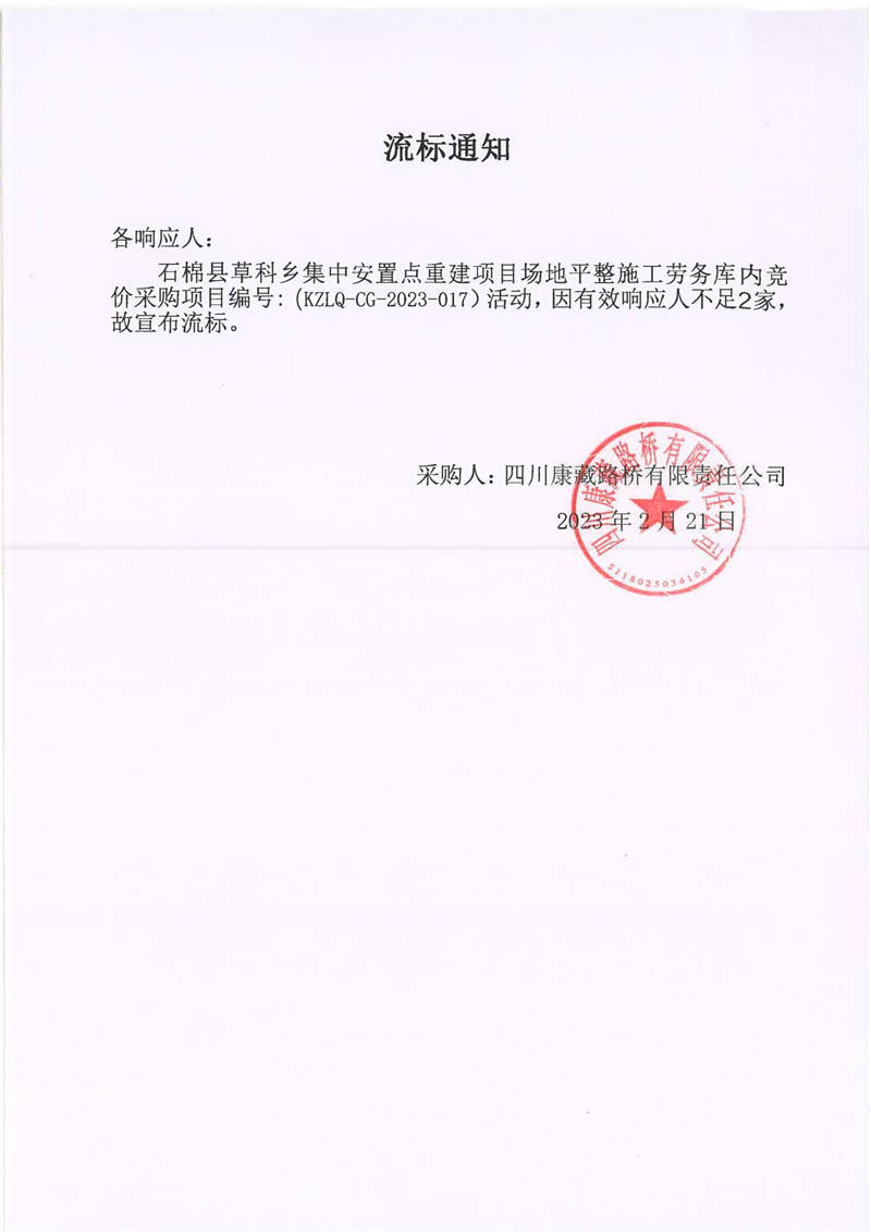四川康藏路橋有限責(zé)任公司石棉草科鄉(xiāng)集中安置點重建項目場地平整施工勞務(wù)庫內(nèi)競價流標(biāo)通知