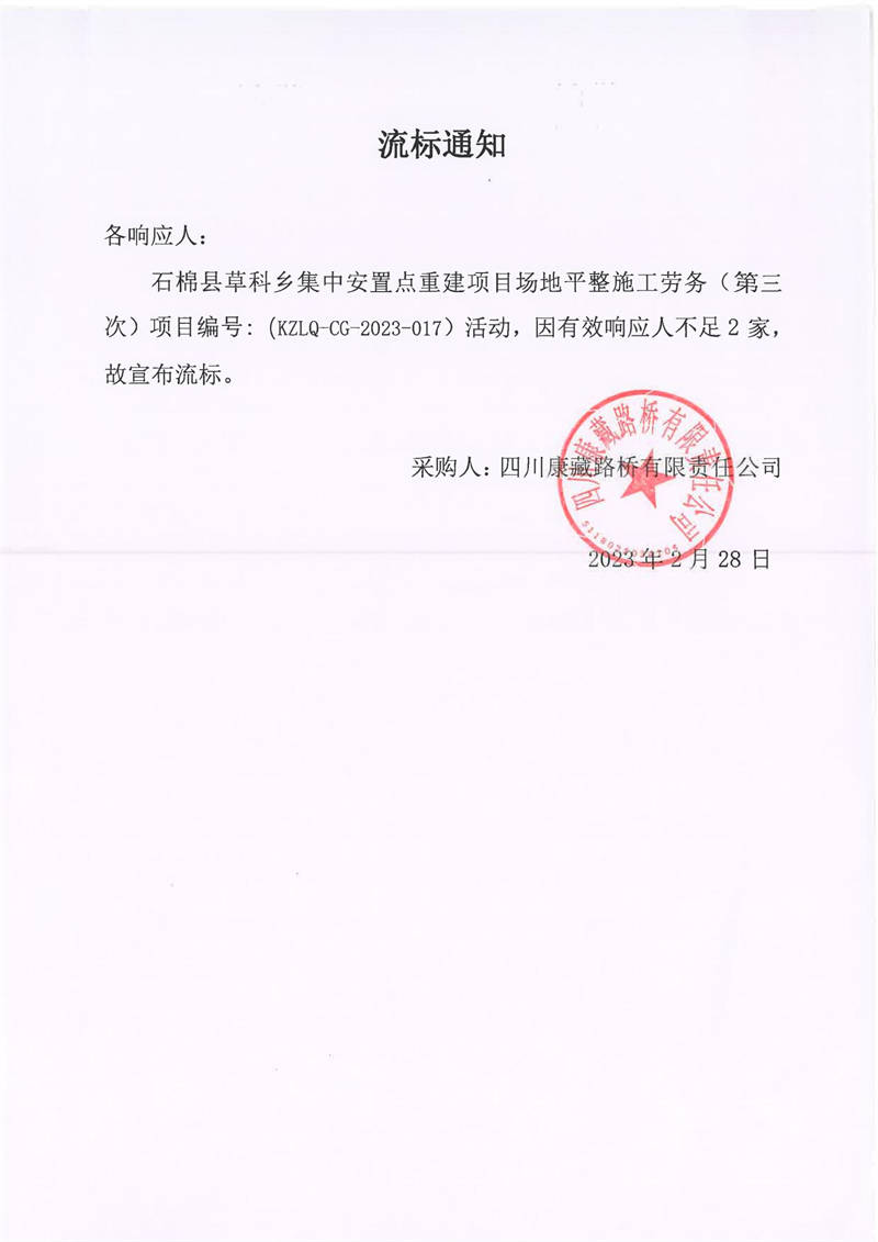 四川康藏路橋有限責任公司石棉草科鄉(xiāng)集中安置點重建項目場地平整施工勞務(第三次)庫內競價流標通知
