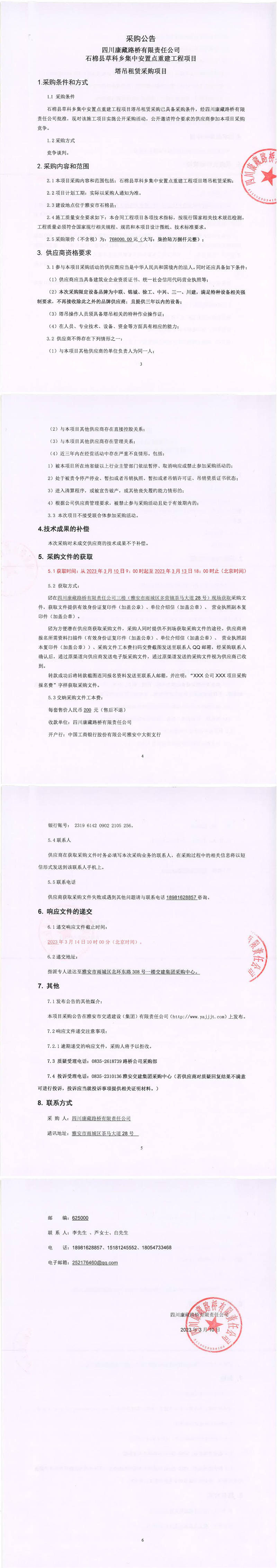 四川康藏路橋有限責(zé)任公司石棉縣草科鄉(xiāng)集中安置點重建工程項目塔吊租賃采購公告