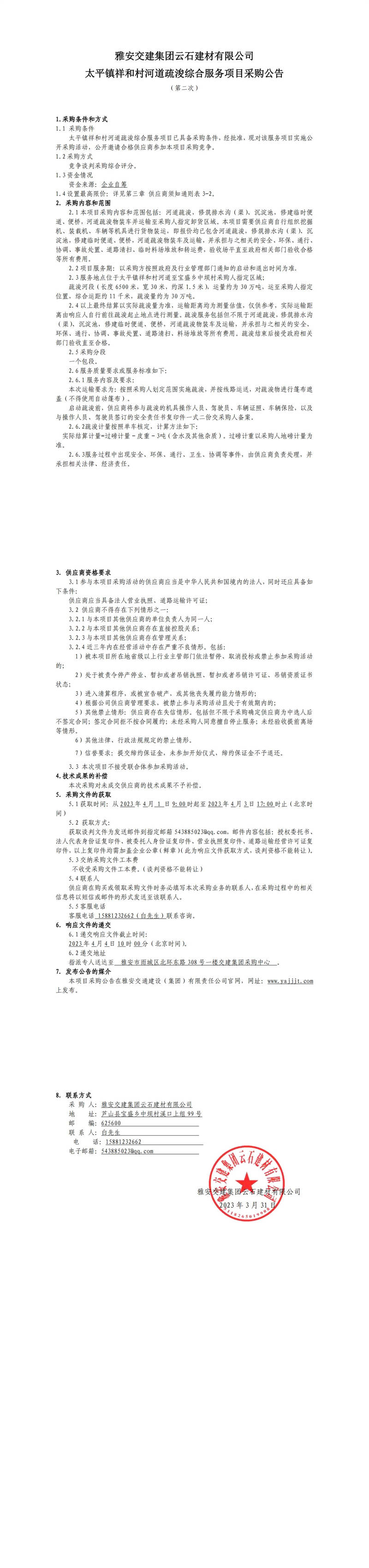 雅安交建集團云石建材有限公司太平鎮(zhèn)祥和村河道疏浚綜合服務(wù)項目采購公告(第二次)