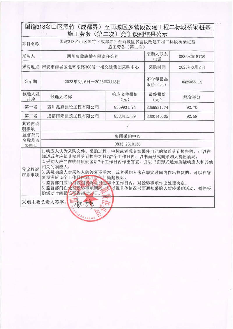 四川康藏路橋有限責任公司國道318名山區(qū)黑竹(成都界)至雨城區(qū)多營段改建工程二標段橋梁樁基施工勞務(第二次)競爭談判結果公示
