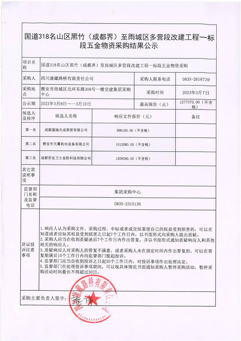 四川康藏路橋有限責(zé)任公司國道318名山區(qū)黑竹(成都界)至雨城區(qū)多營段改建工程一標(biāo)段五金物資采購結(jié)果公示
