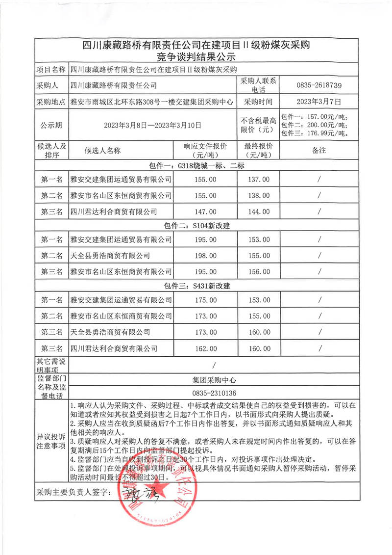 四川康藏路橋有限責(zé)任公司在建項(xiàng)目II級(jí)粉煤灰采購(gòu)競(jìng)爭(zhēng)談判結(jié)果公示