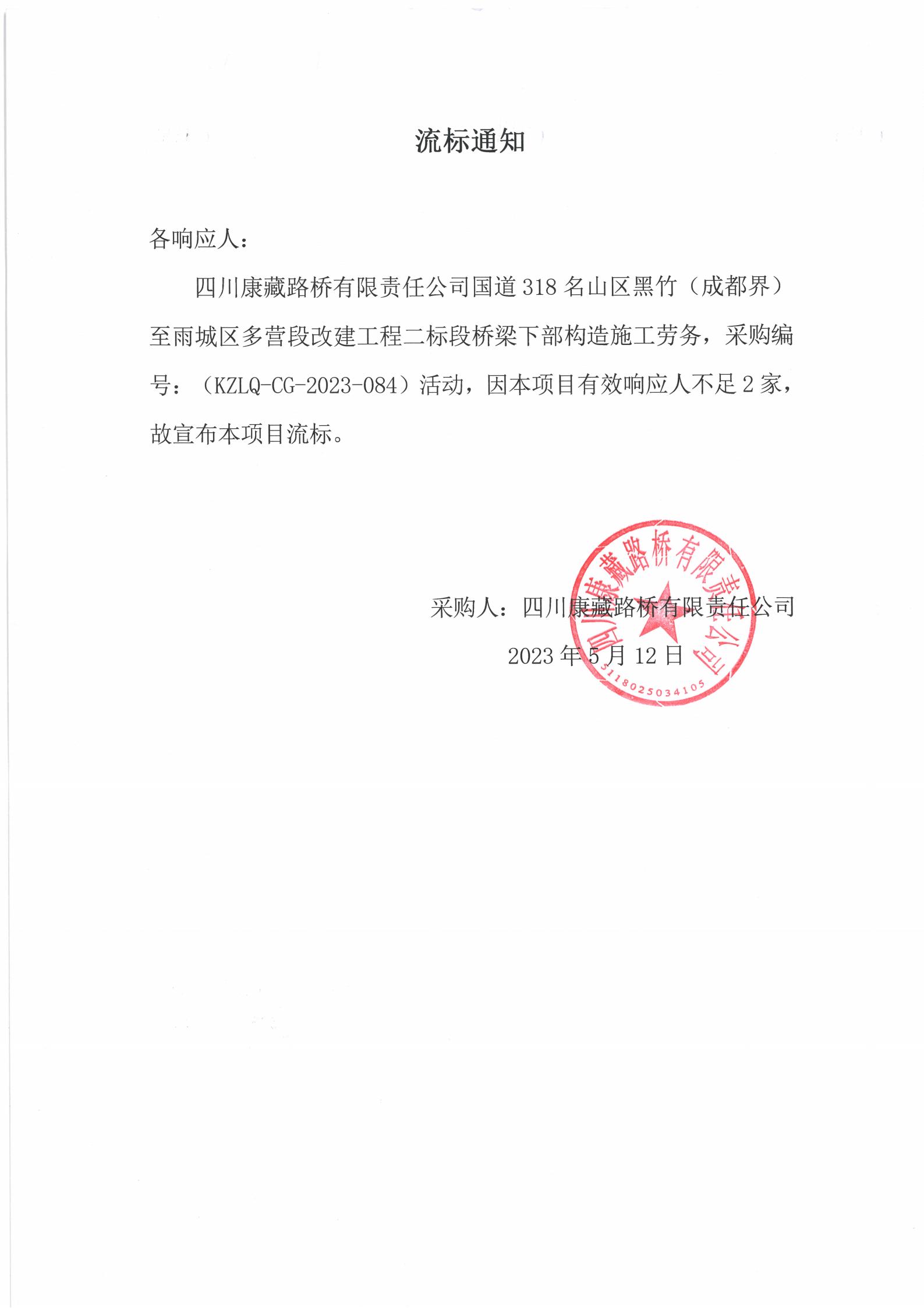 四川康藏路橋有限責(zé)任公司國(guó)道318名山區(qū)黑竹(成都界)至雨城區(qū)多營(yíng)段改建工程二標(biāo)段橋梁下部構(gòu)造施工勞務(wù)流標(biāo)通知