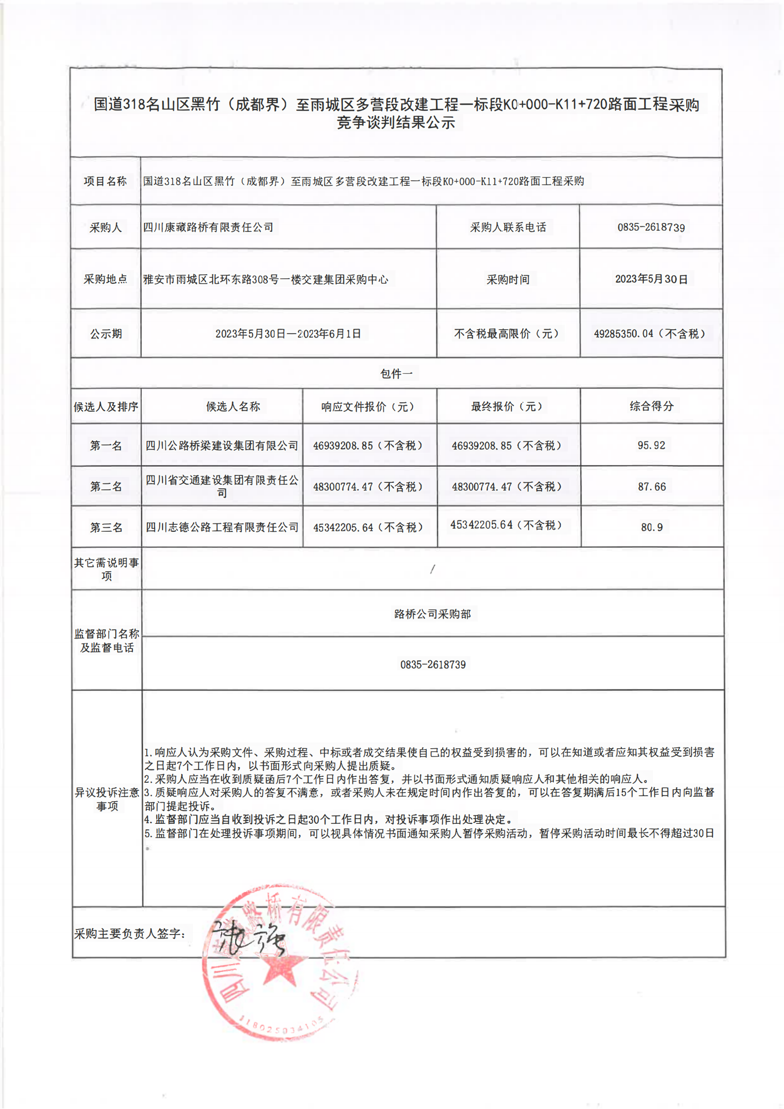 四川康藏路橋有限責(zé)任公司國道318名山區(qū)黑竹(成都界)至雨城區(qū)多營段改建工程一標(biāo)段K0+000-K11+720路面工程采購競(jìng)爭談判結(jié)果公示