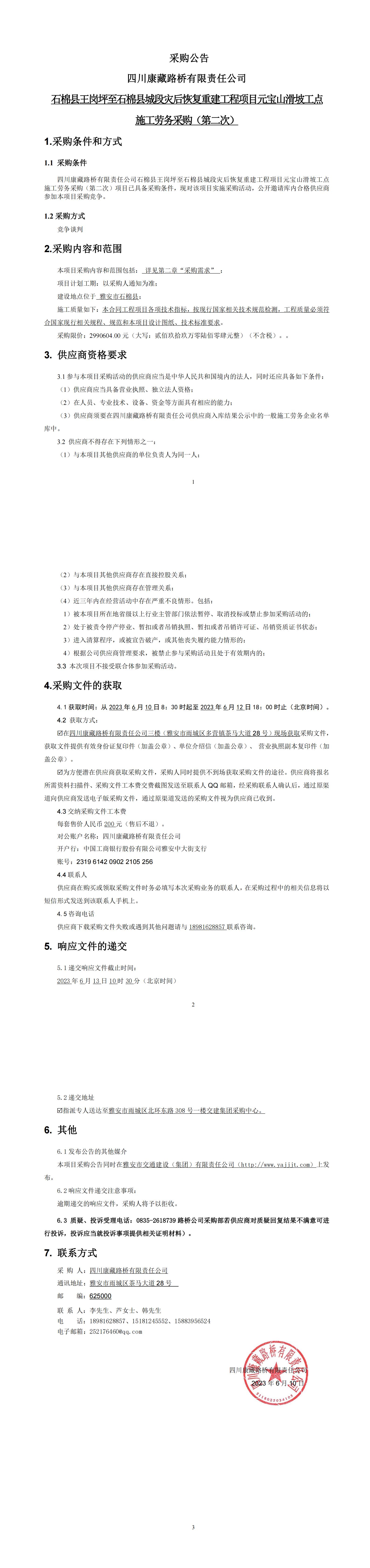 四川康藏路橋有限責任公司石棉縣王崗坪至石棉縣城段災后恢復重建工程項目元寶山滑坡工點施工勞務采購(第二次)