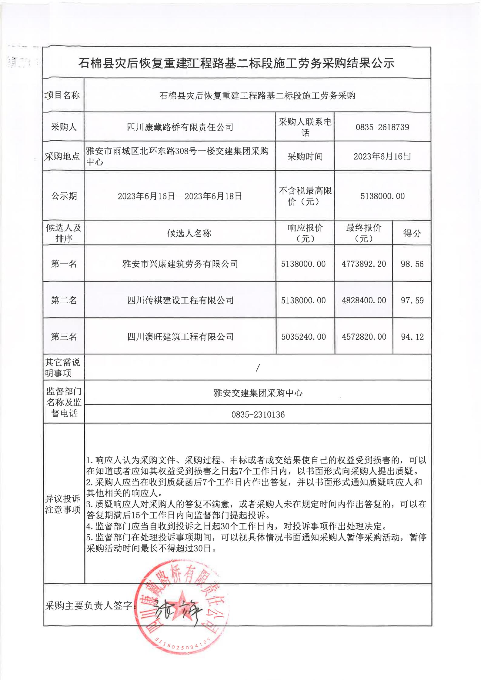 四川康藏路橋有限責(zé)任公司石棉縣災(zāi)后恢復(fù)重建工程路基二標段施工勞務(wù)采購結(jié)果公示