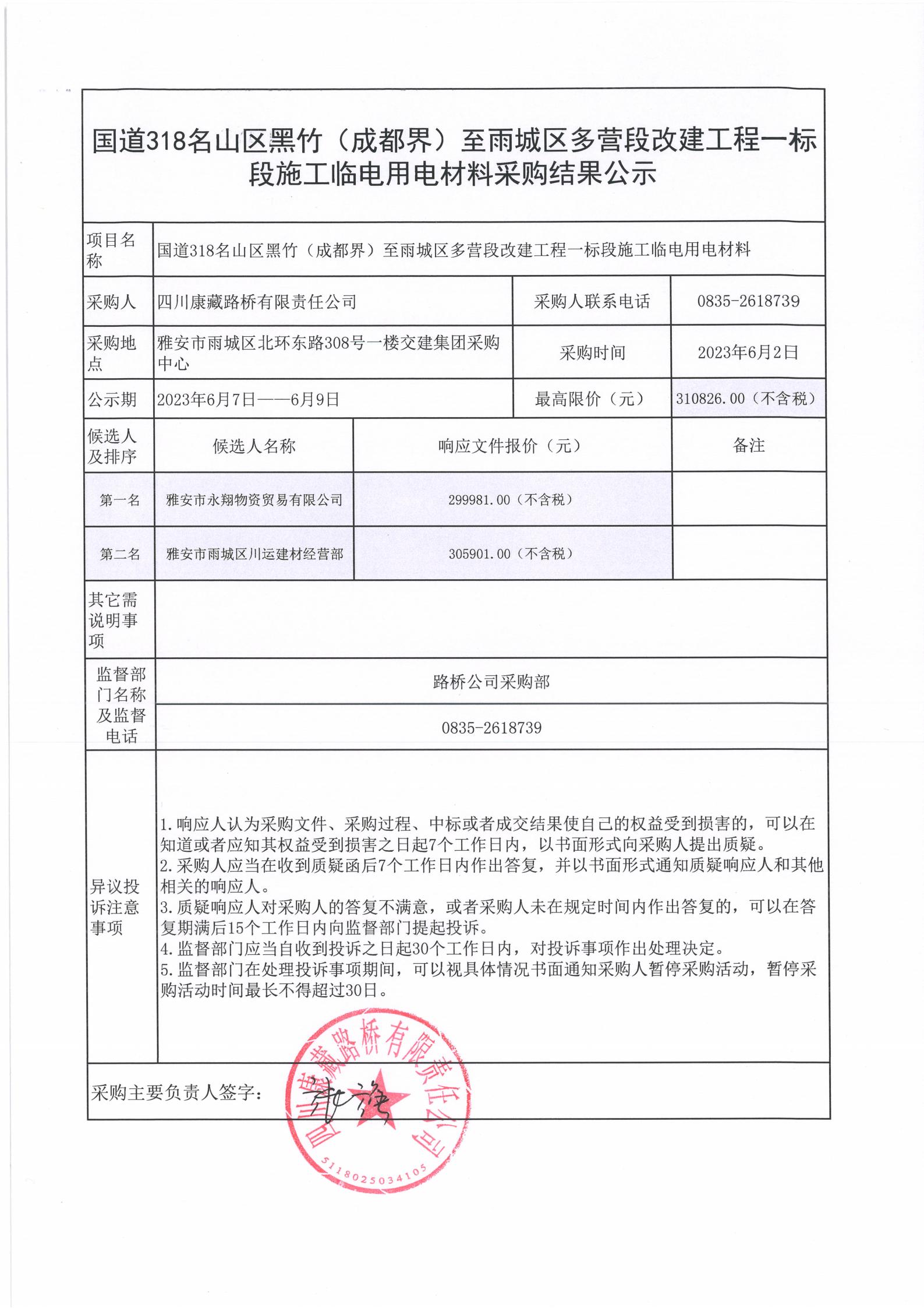 四川康藏路橋有限責(zé)任公司國(guó)道318名山區(qū)黑竹(成都界)至雨城區(qū)多營(yíng)段改建工程一標(biāo)段施工臨電用電材料采購(gòu)結(jié)果公示