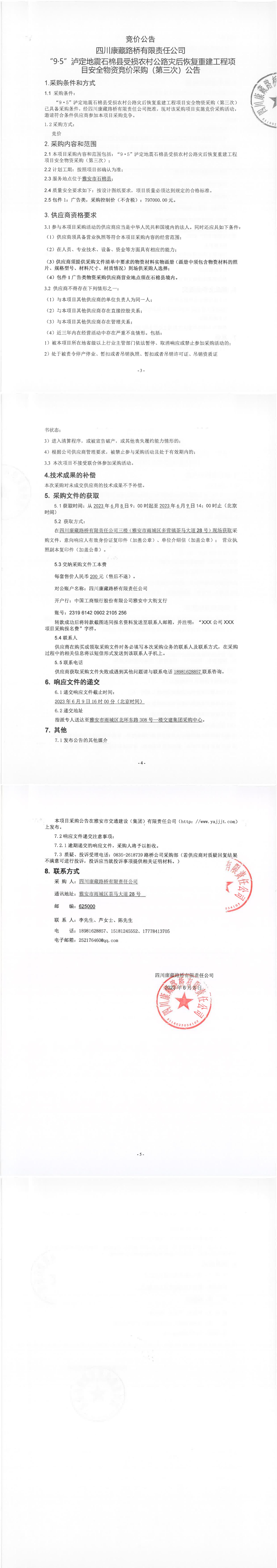 四川康藏路橋有限責任公司“9·5”瀘定地震石棉縣受損農(nóng)村公路災(zāi)后恢復(fù)重建工程項目安全物資競價采購(第三次)公告
