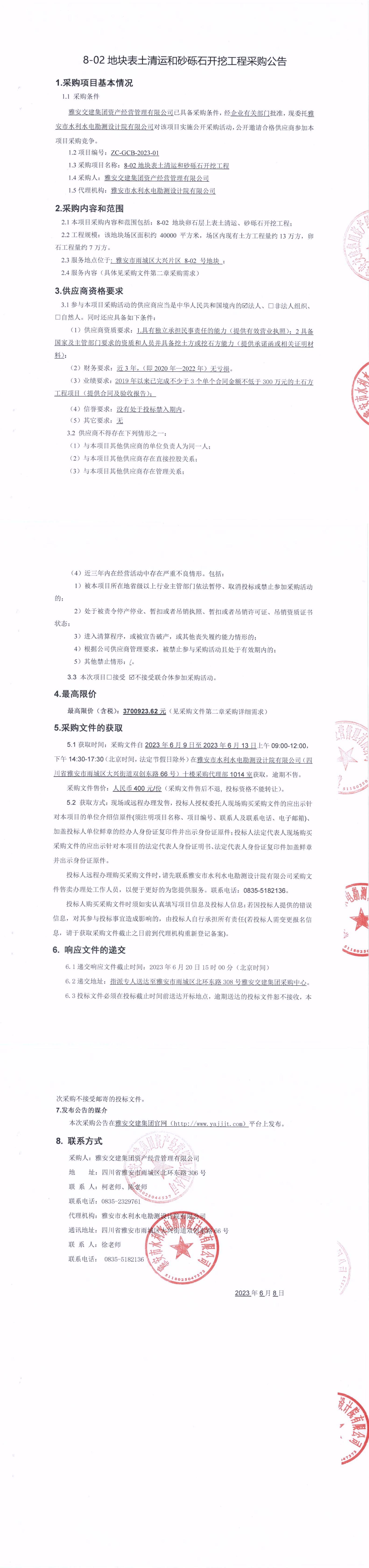 雅安交建集團(tuán)資產(chǎn)經(jīng)營(yíng)管理有限公司8-02地塊表土清運(yùn)和砂礫石開挖工程采購(gòu)公告
