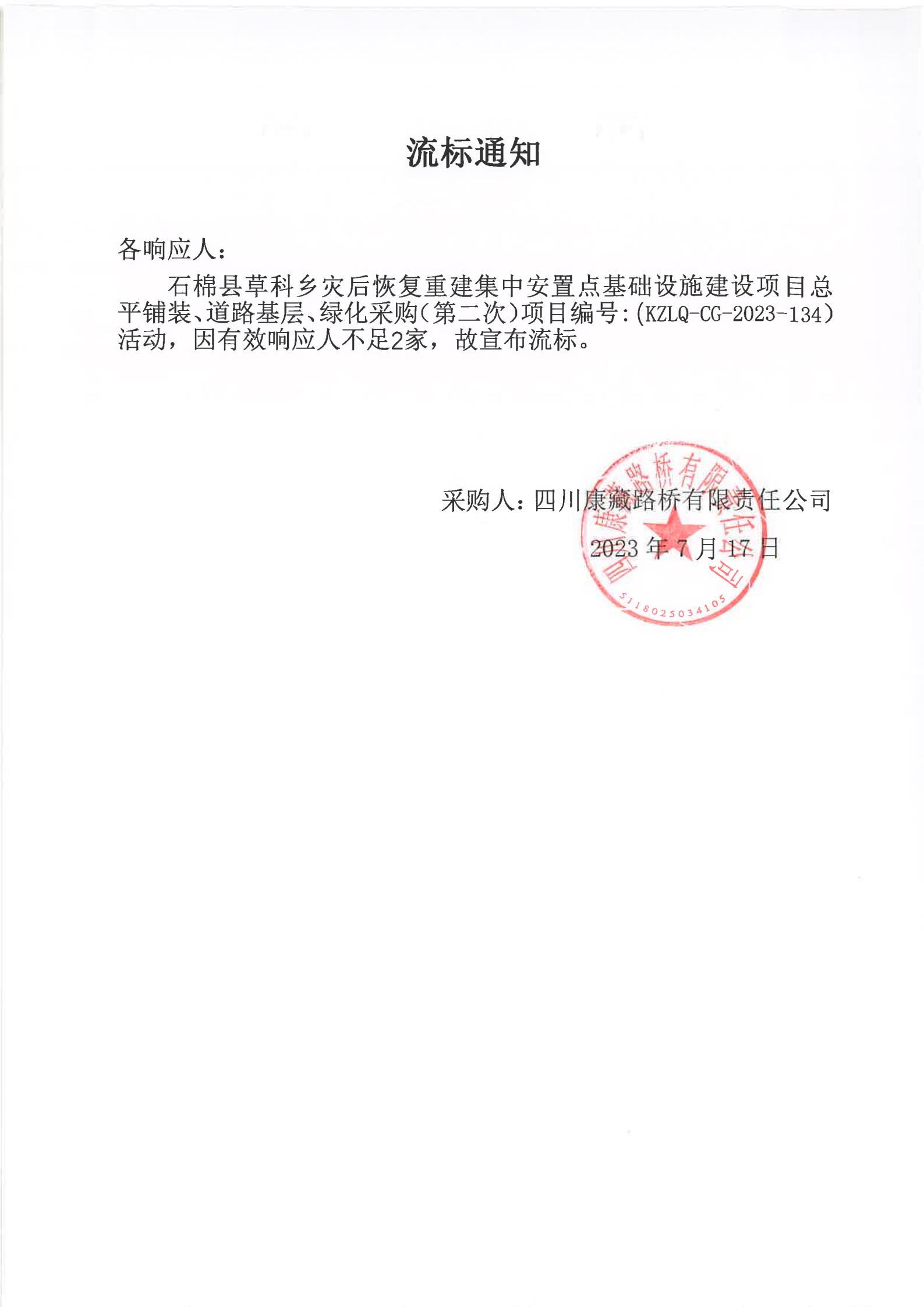 四川康藏路橋有限責任公司石棉縣草科鄉(xiāng)災(zāi)后恢復重建集中安置點基礎(chǔ)設(shè)施建設(shè)項目總平鋪裝、道路基層、綠化采購(第二次)流標通知